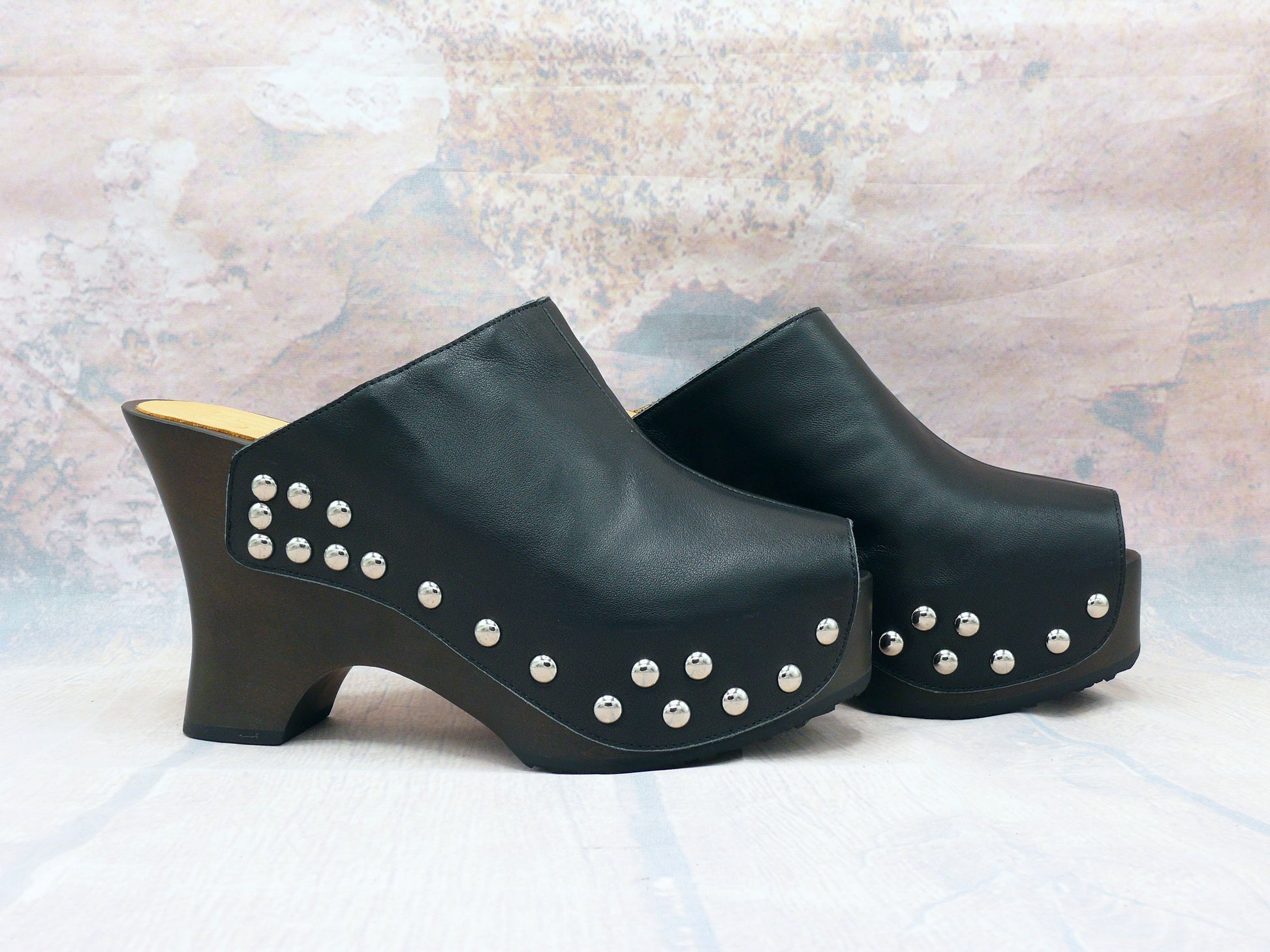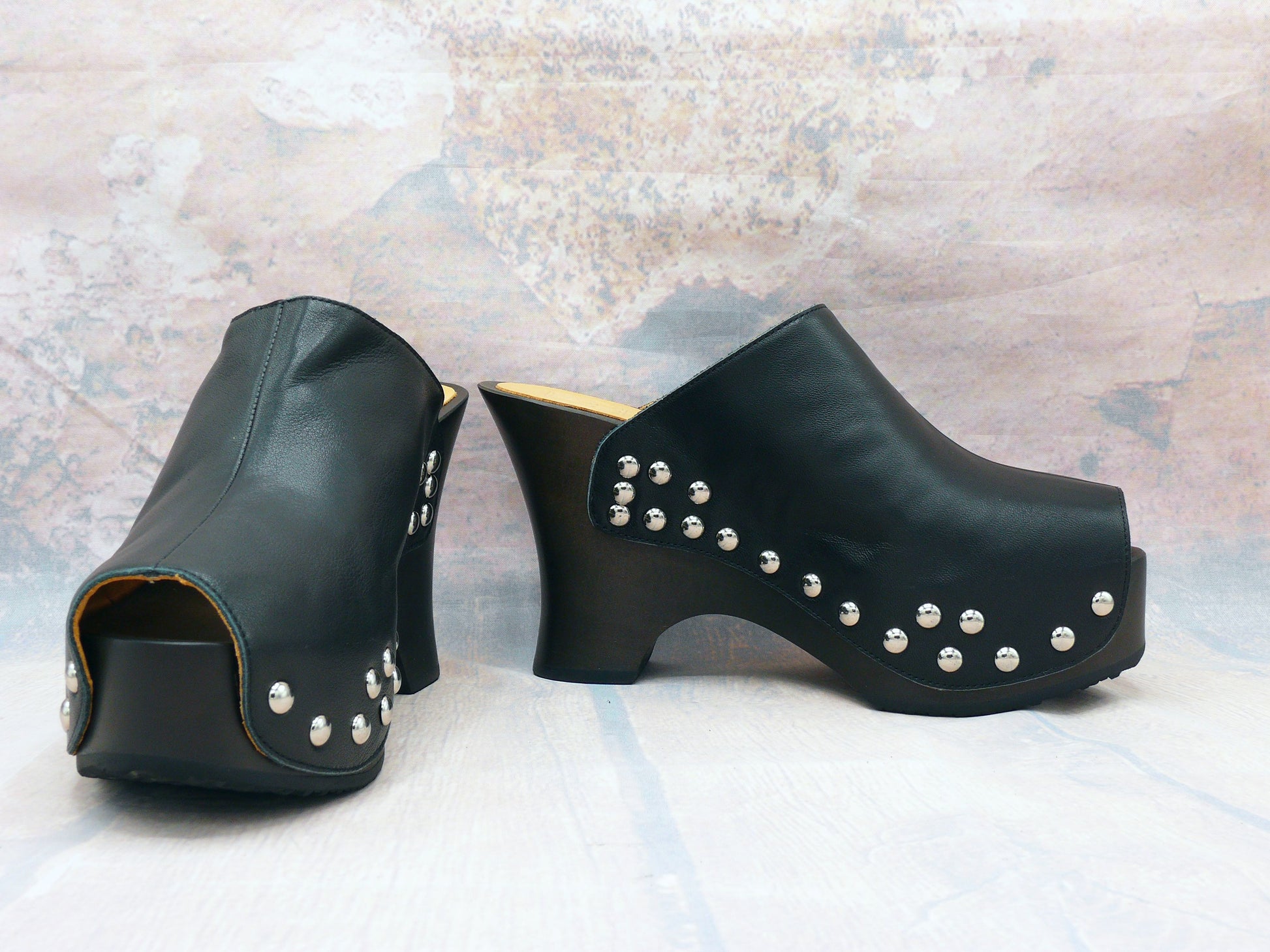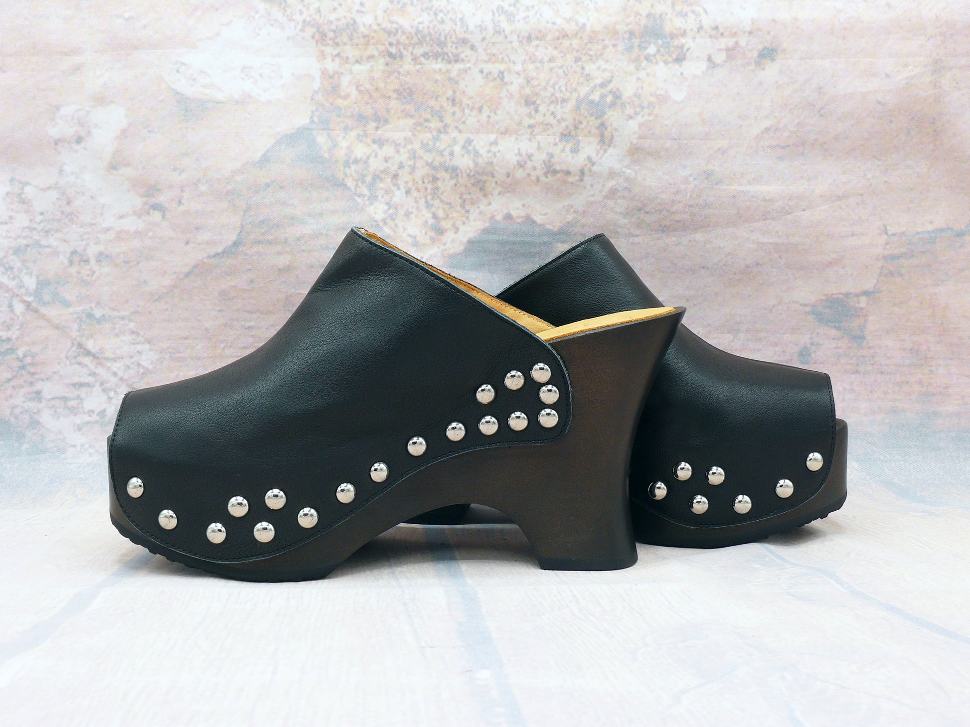 Sabots en bois noir, confectionnés en cuir de vachette et ornés de rivets originaux – matière pure, design sans compromis