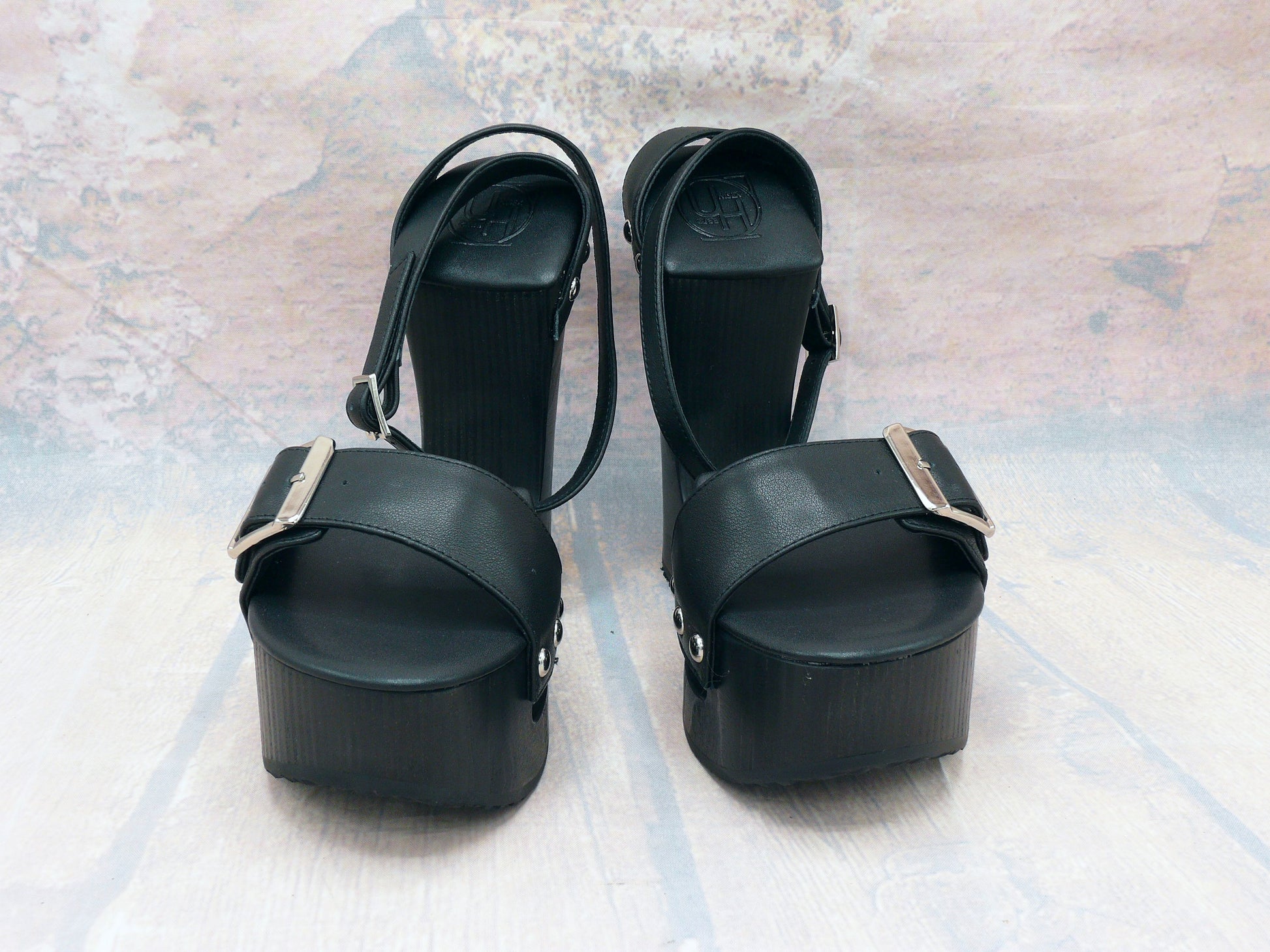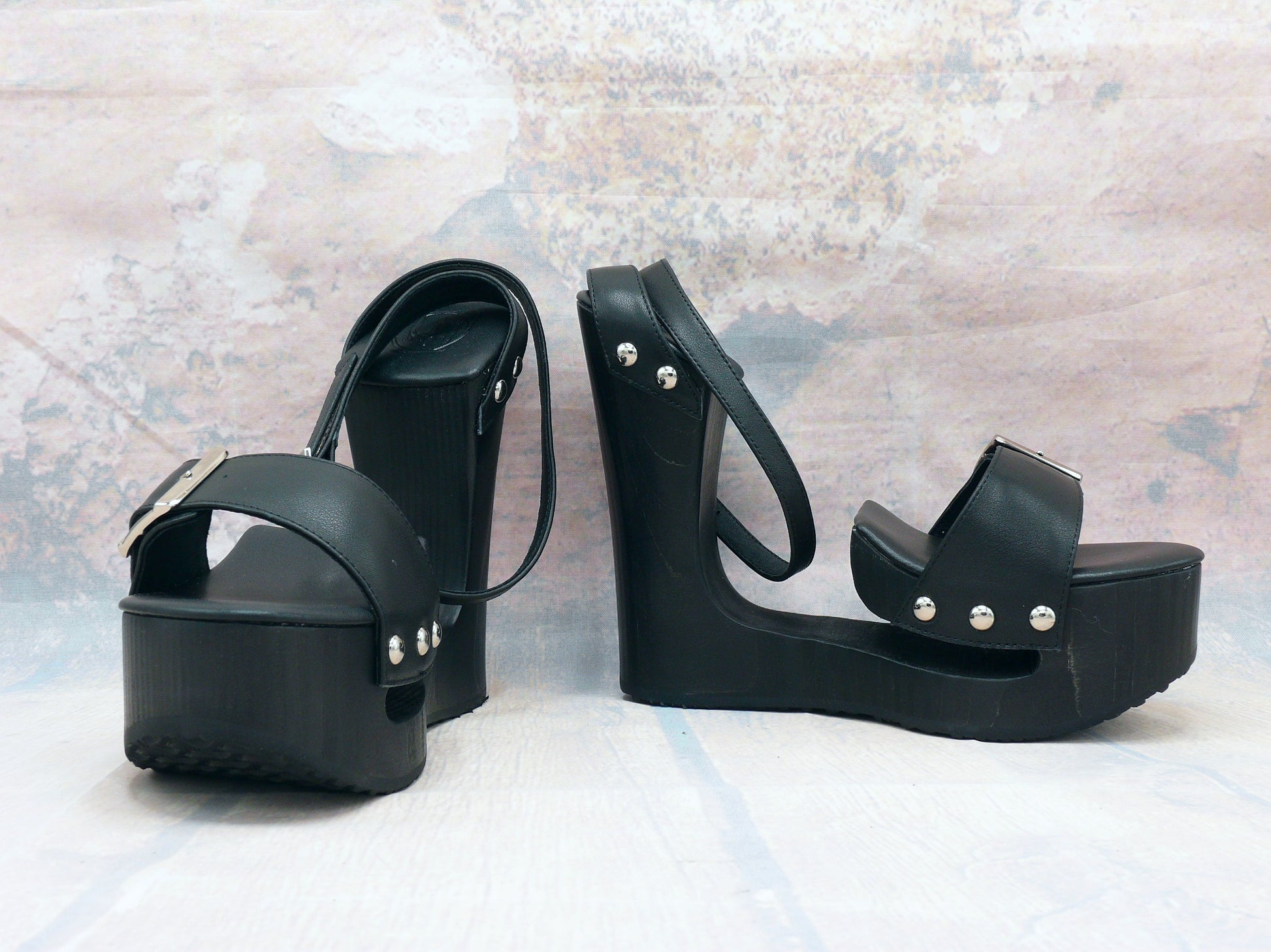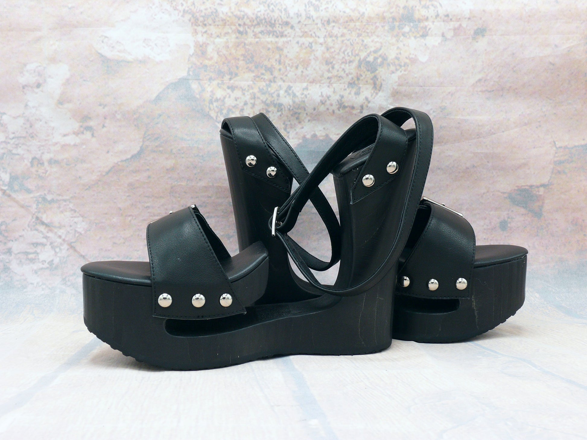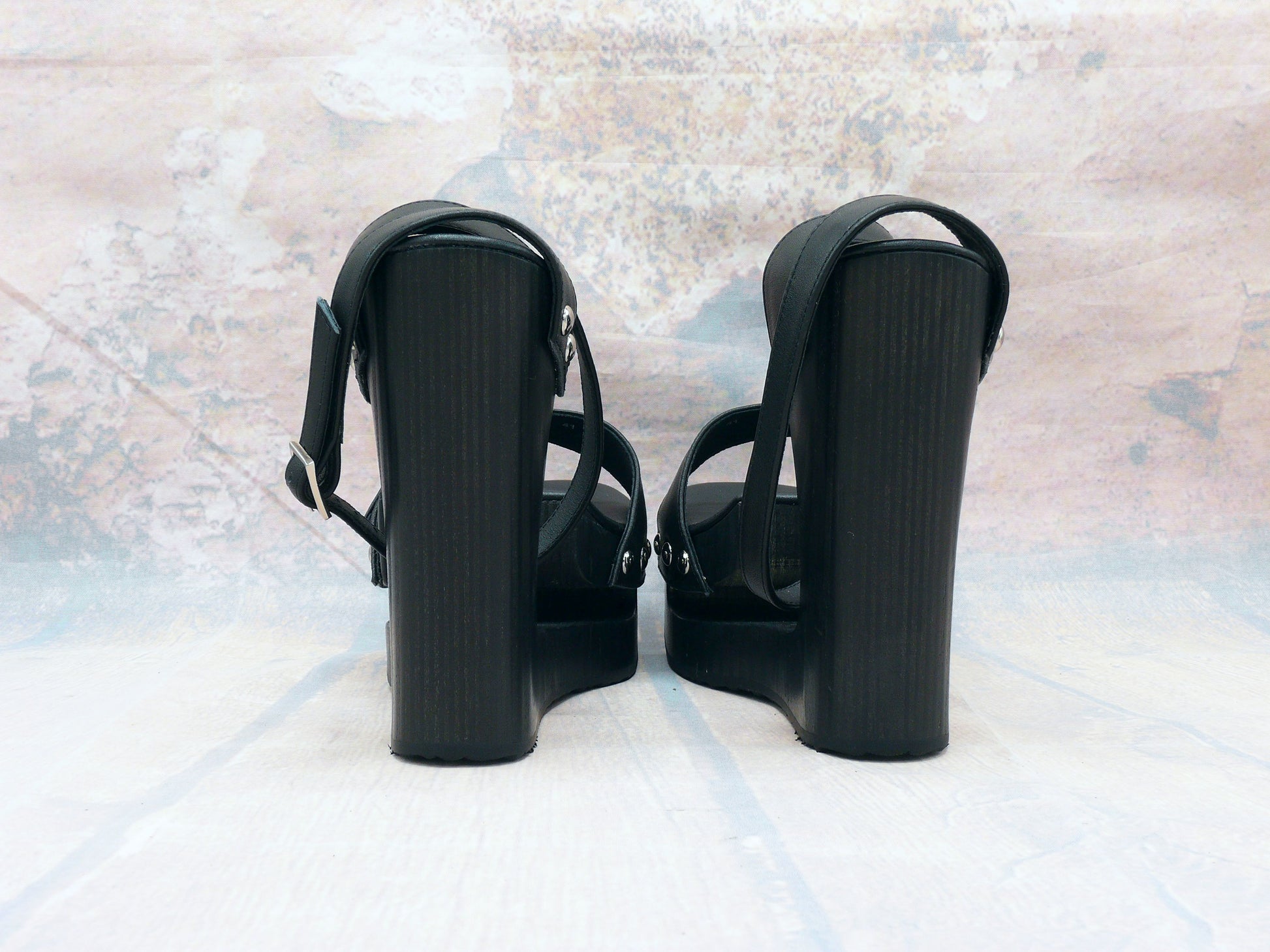 Ces sandales à plateforme exceptionnelles se distinguent par un design saisissant , une hauteur maximale et une authentique sensation de bois . La semelle en bois noir massif, avec son talon compensé expressif, confère aux sandales une silhouette affirmée tout en assurant une excellente stabilité. L'empeigne en cuir noir de haute qualité est élégamment rehaussée de clous métalliques bien visibles et d'une boucle réglable .